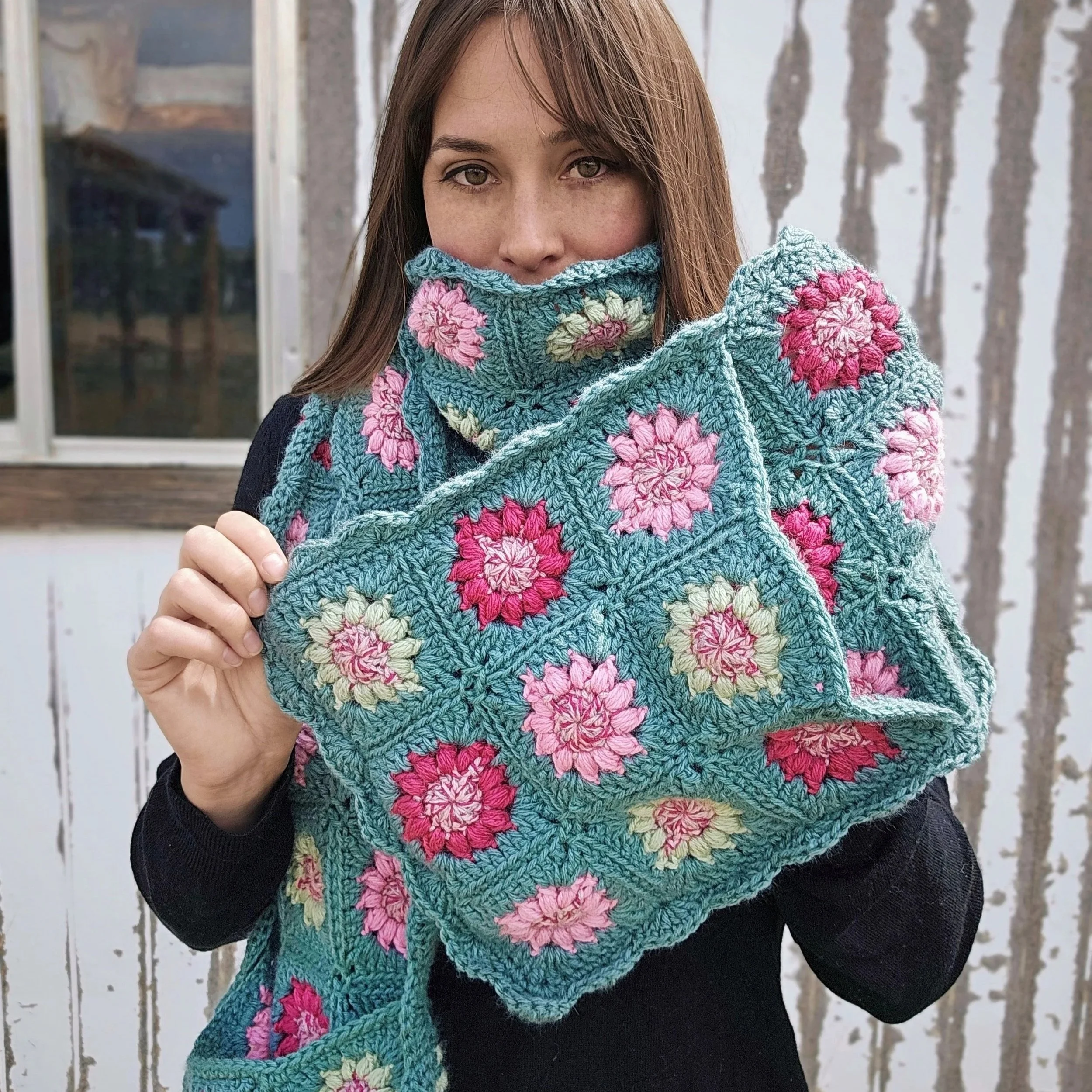 The scarf is made using granny square motifs with puff stitch details that create a soft floral texture, giving it a unique, handcrafted look that stands out from basic scarves. It’s also a relaxing, modular project, so you can enjoy making it one square at a time without feeling overwhelmed by a large project.