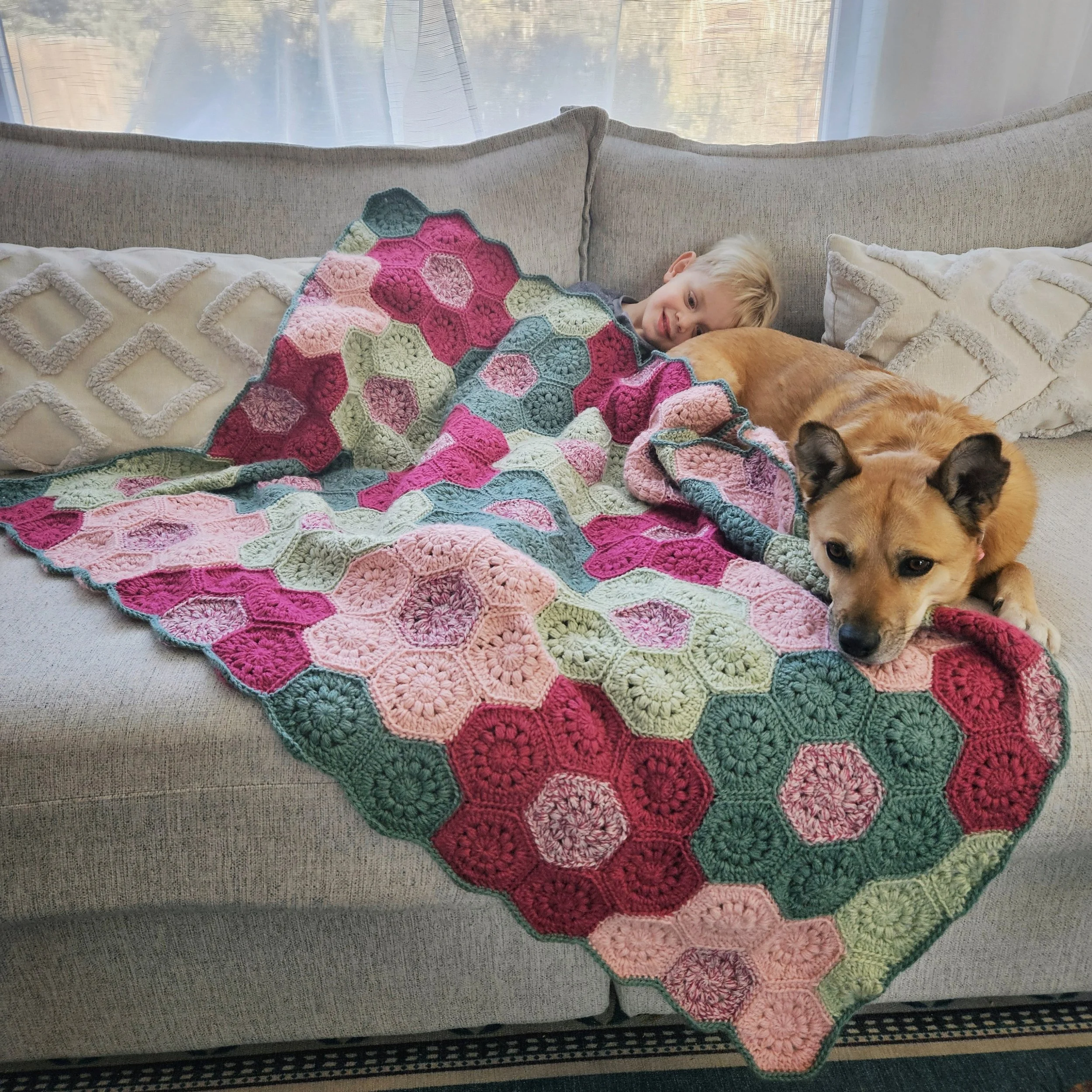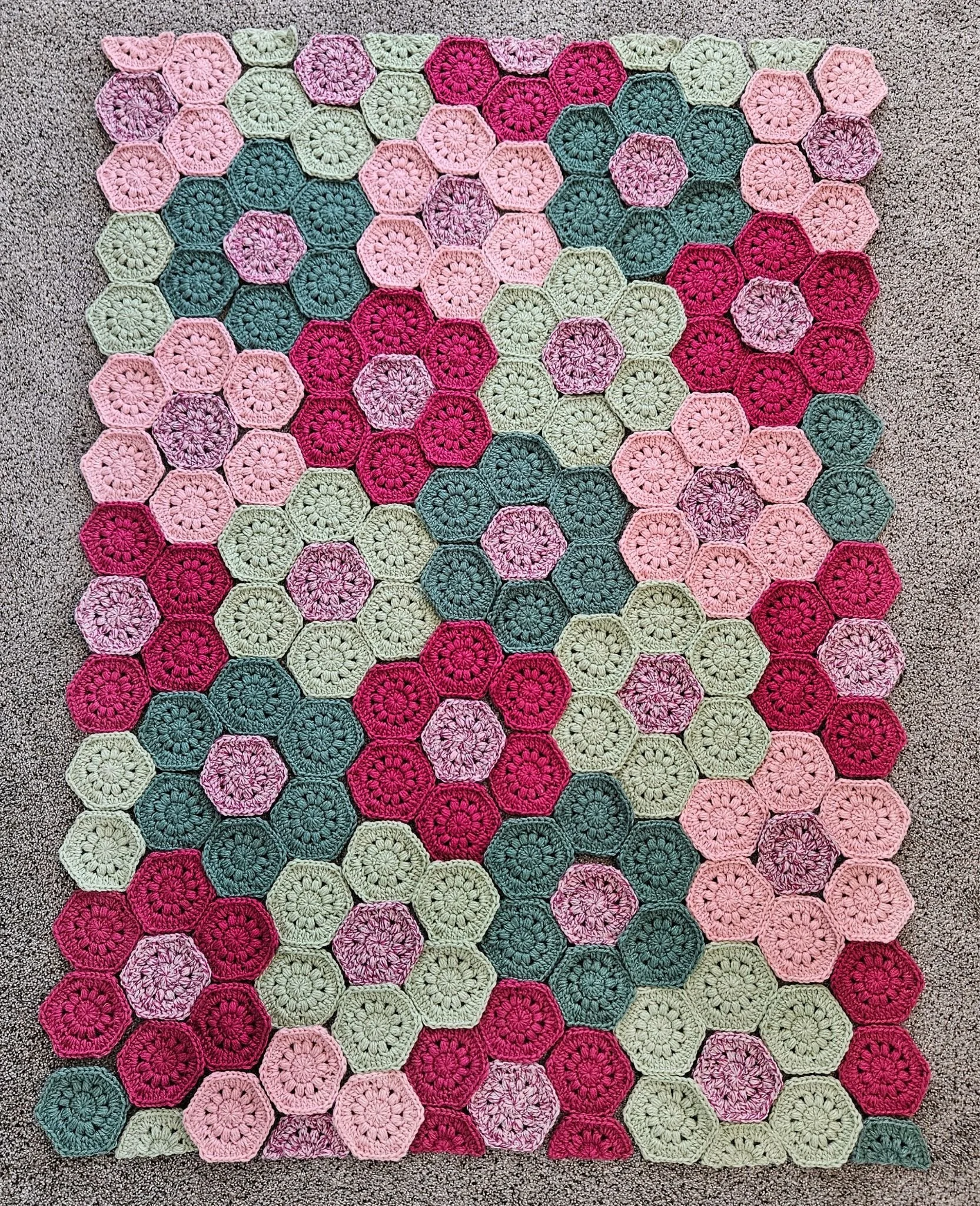 The blanket is constructed from individual hexagon motifs, which are seamed together after all motifs are completed.