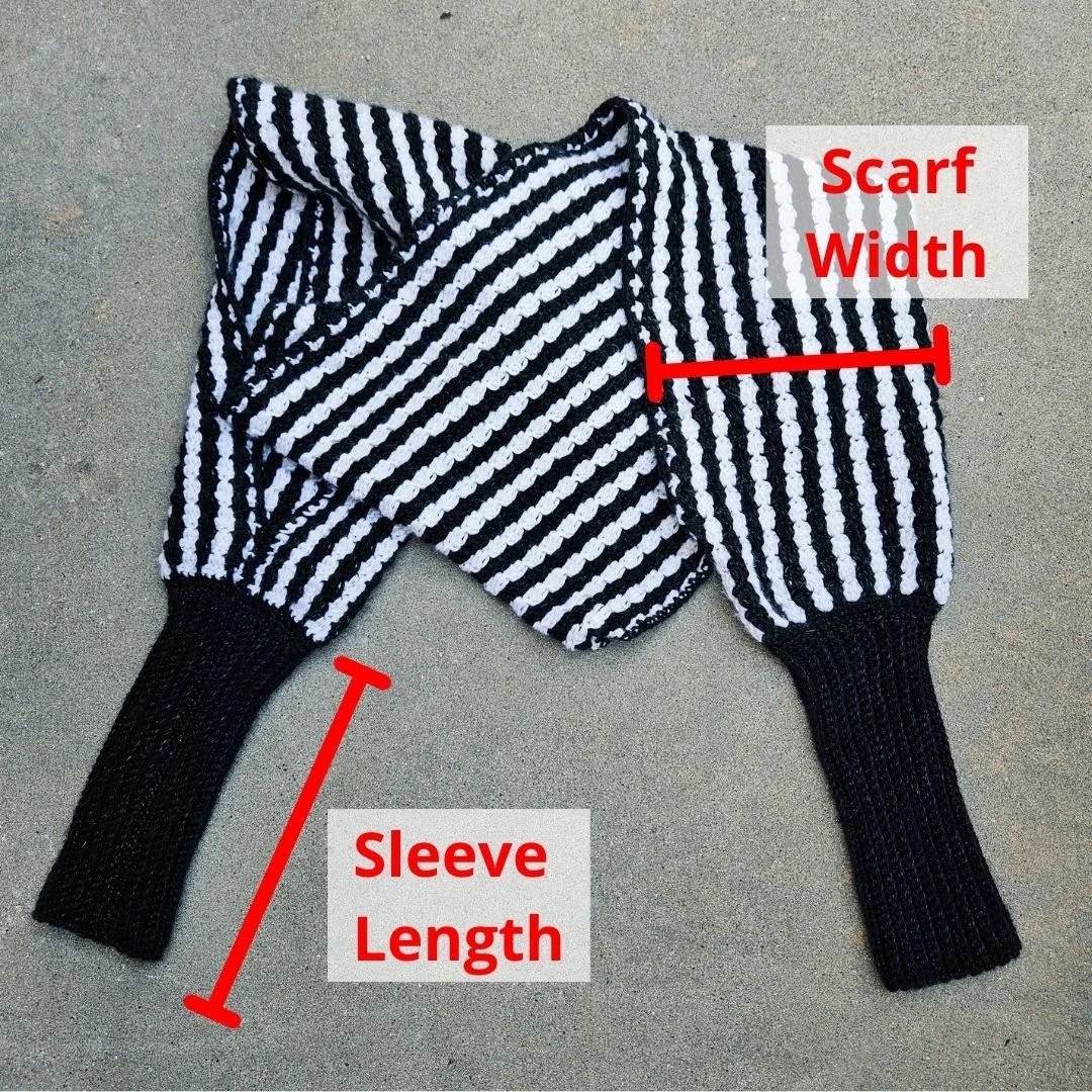 Scarf Length (total with sleeves): 159 (173) 186 (200) 215 (243) 256 (270)